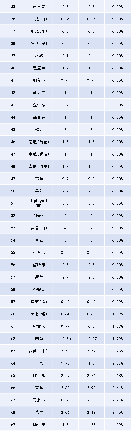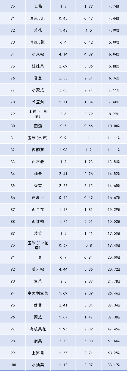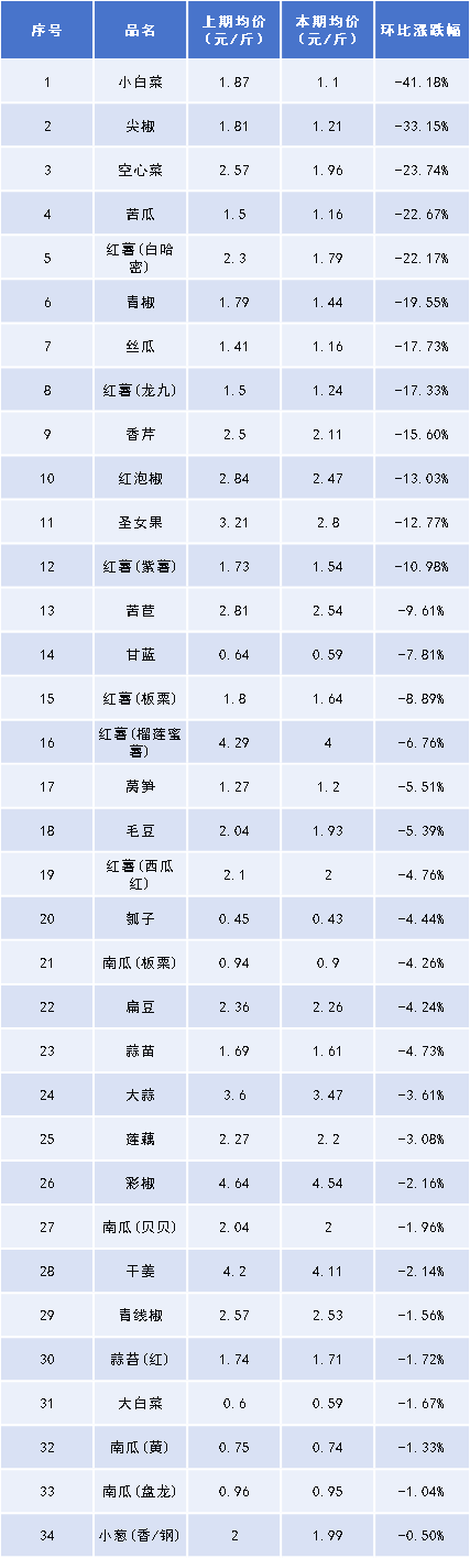 从具体蔬菜品种来看,本期价格上涨的蔬菜有41种,占总蔬菜品种41.00%,其中小油菜本期均价2.07元/斤,上期均价1.13元/斤,环比涨幅达83.19%;价格下跌的蔬菜有34种,占总蔬菜品种34.00%,其中小白菜本期均价1.10元/斤,上期均价1.87元/斤,环比下降41.18%;本期价格持平的蔬菜有25种。