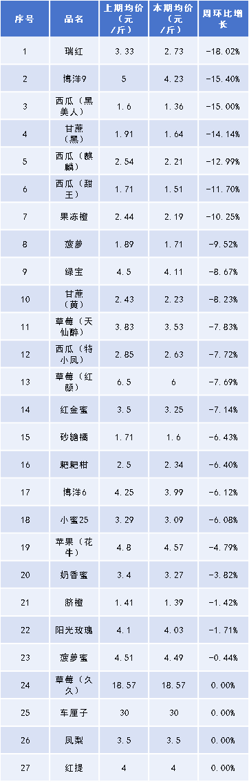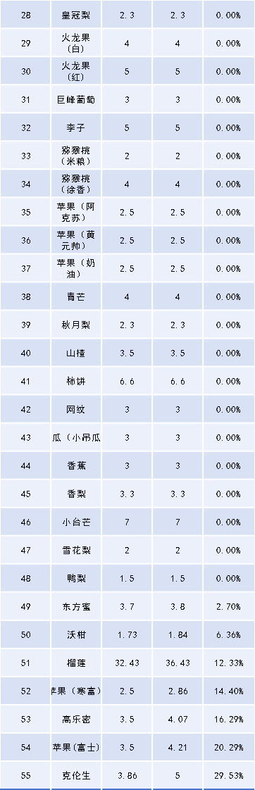 从具体水果品种来看,价格上涨的有7种,占总水果品种的12.73%,其中克伦生本期均价5.00元/斤,上期均价3.86元/斤,环比涨幅达29.53%;价格下跌的有23种,占总水果品种的41.82%,其中瑞红本期均价2.73元/斤,上期均价3.33元/斤,环比下降18.02%;价格持平的水果有25种。